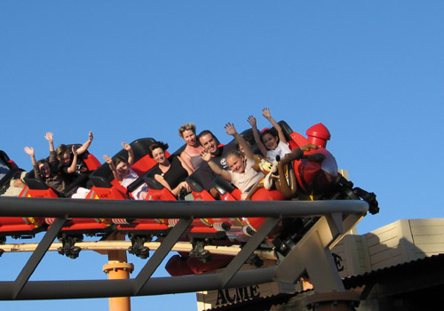 Ainsley and Tayla on the Road Runner Roller Coaster at Movie World